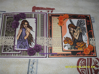 I have used white card stock to make the square card, Authentique Glowing patterned paper x 3, Coredinations Nightfall card stock, Coredinations Persimmon card stock, Spectrum Noir pens numbers 132, 133, 142, 196, 104, 100, 96, 0, 175, 185, 11, BG1, 35, 33, 24, 135, Lace, Flowers, Pearls and of course the lovely rubber stamped image from Crafts and Me called Violet Angel.