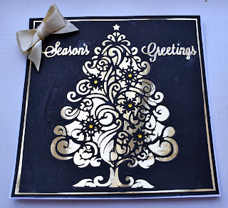 I thought I would do a few basic diecut Christmas Cards for a change, I have used white card stock to make the square card, Black Crafters Companion card stock, Gold Crafters Companion card stock, Cut n Boss, Gemini Create a Card Christmas Tree Diecut, Sentiments Diecut, Sara Davies Gold Ribbon and Gem Stones.